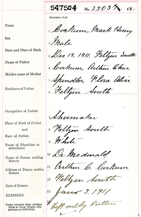 Male Birth Registration: Year: 1911 number: 54700504