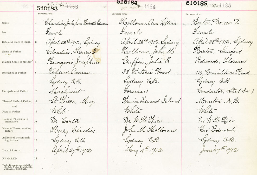 Female Birth Registration: Year: 1912 number: 51000185
