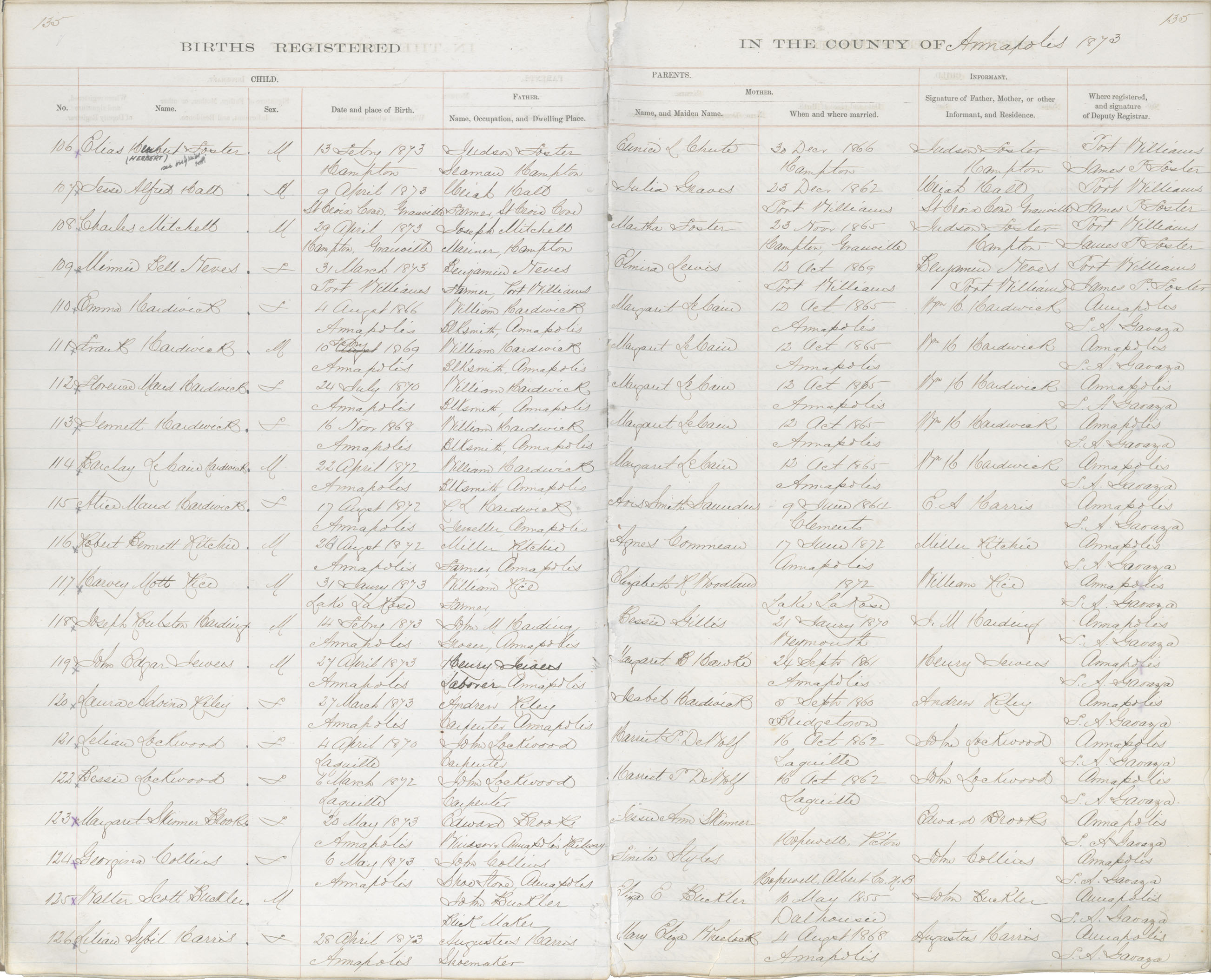 Birth Registration: Year: 1873 book: 1801 page: 135 number: 106