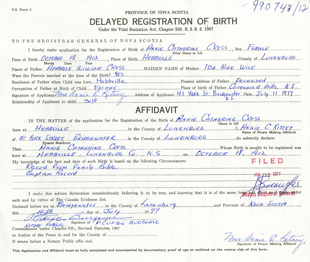Female Birth Registration: Year: 1912 number: 99000748