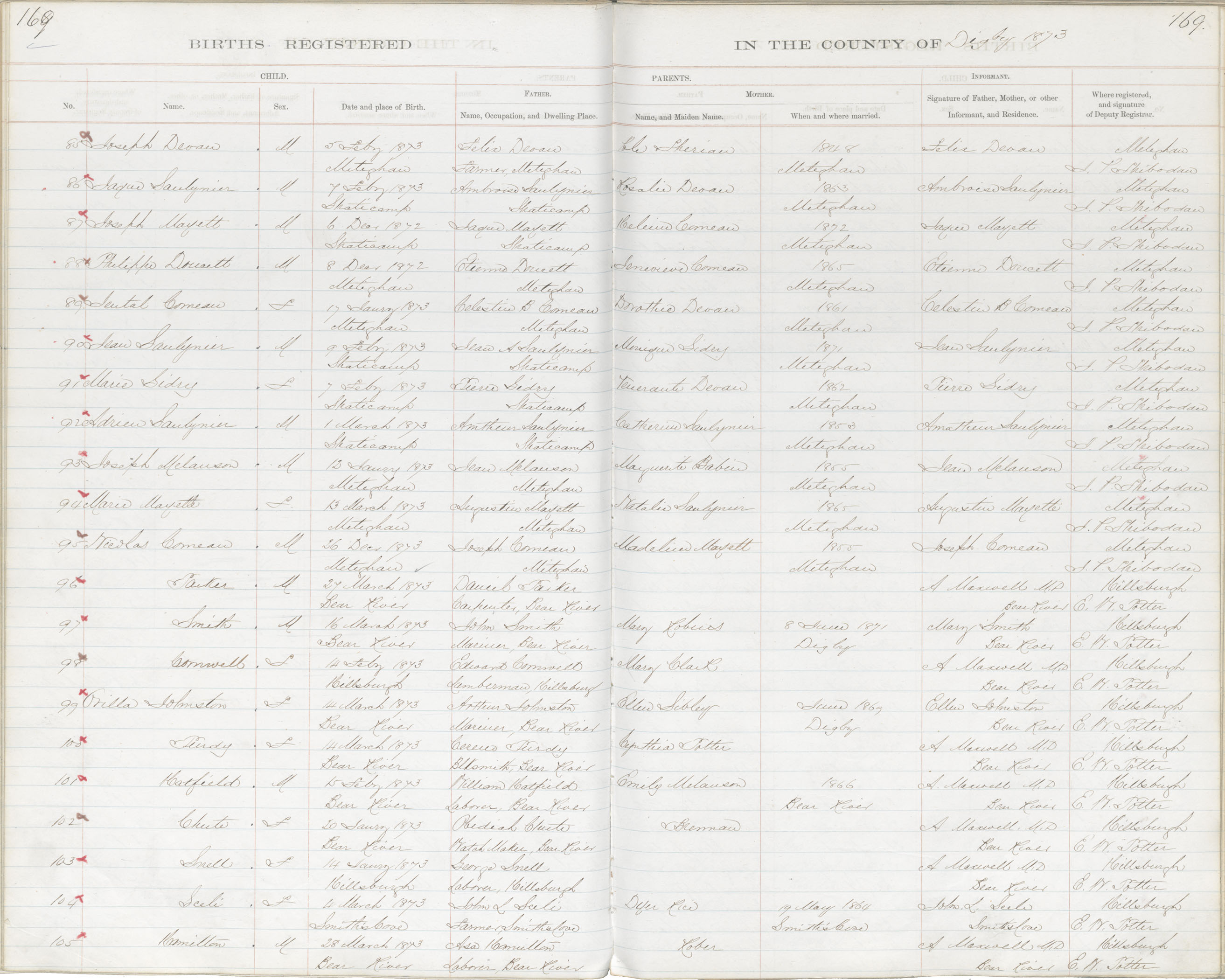 Male Birth Registration: Year: 1873 book: 1807 page: 169 number: 105