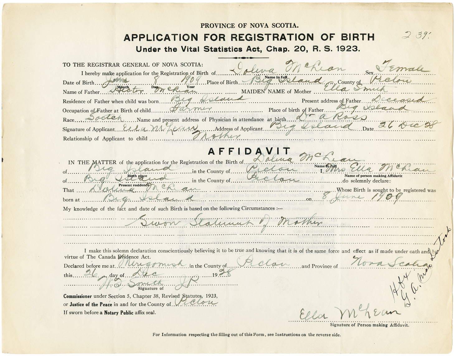 Female Birth Registration: Year: 1909 number: 92900239