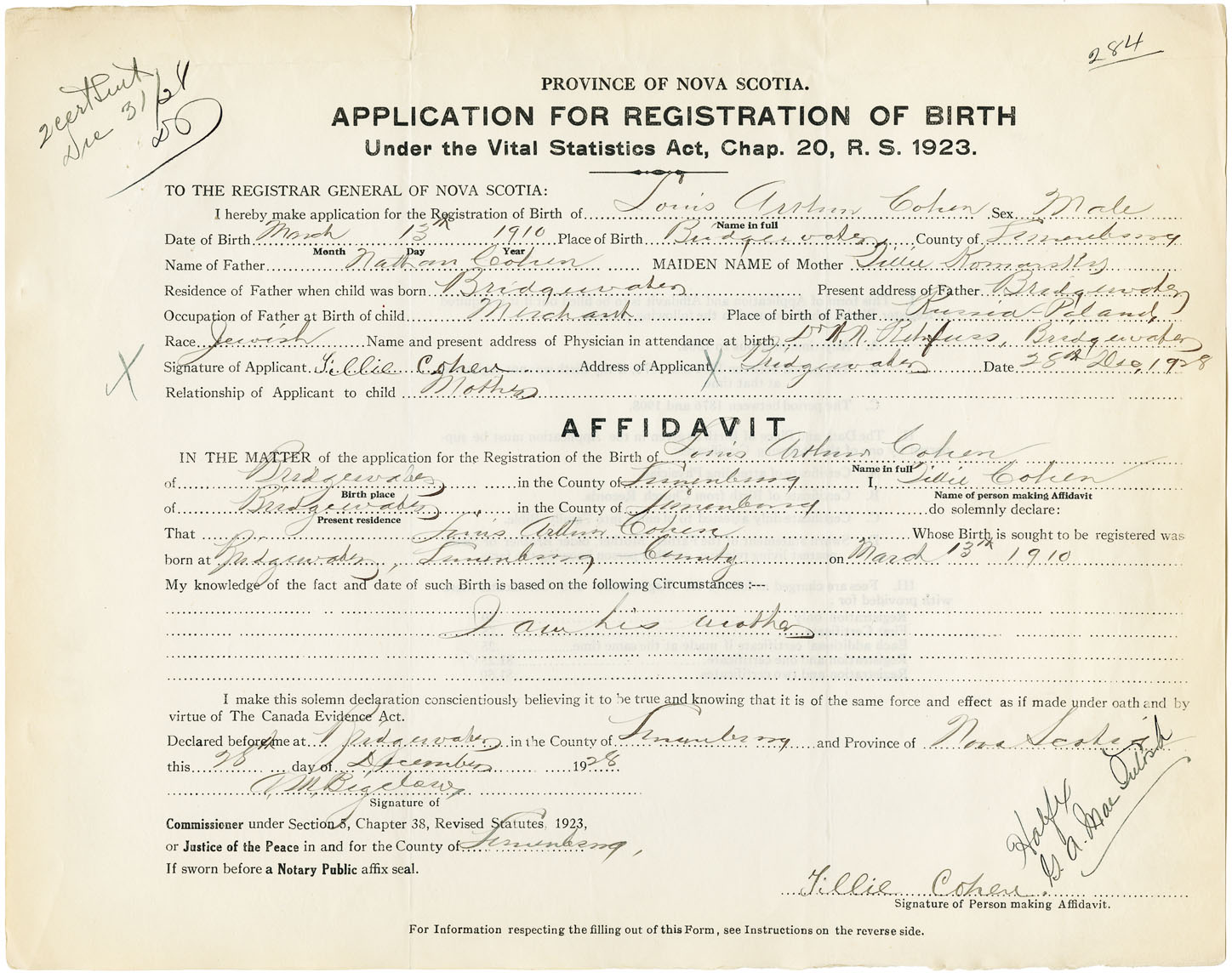 Male Birth Registration: Year: 1910 number: 92900284