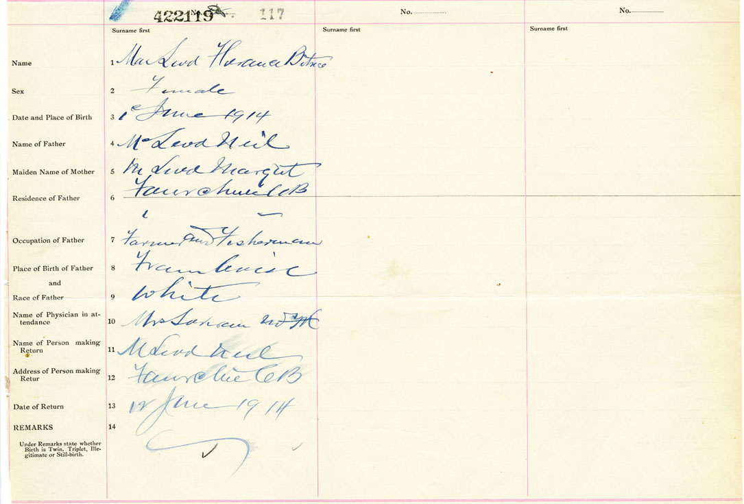 Female Birth Registration: Year: 1914 number: 42200119