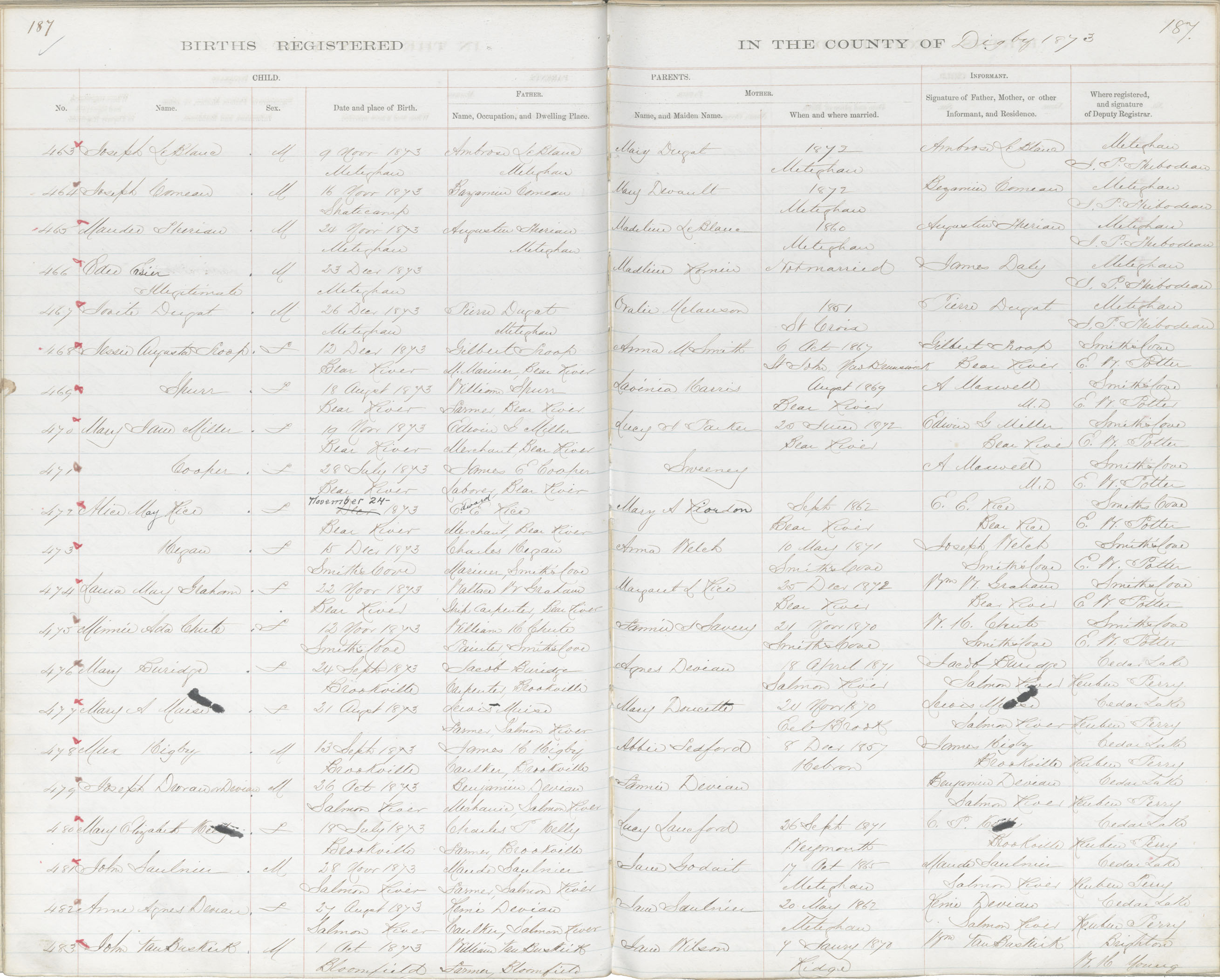 Birth Registration: Year: 1873 book: 1807 page: 187 number: 463