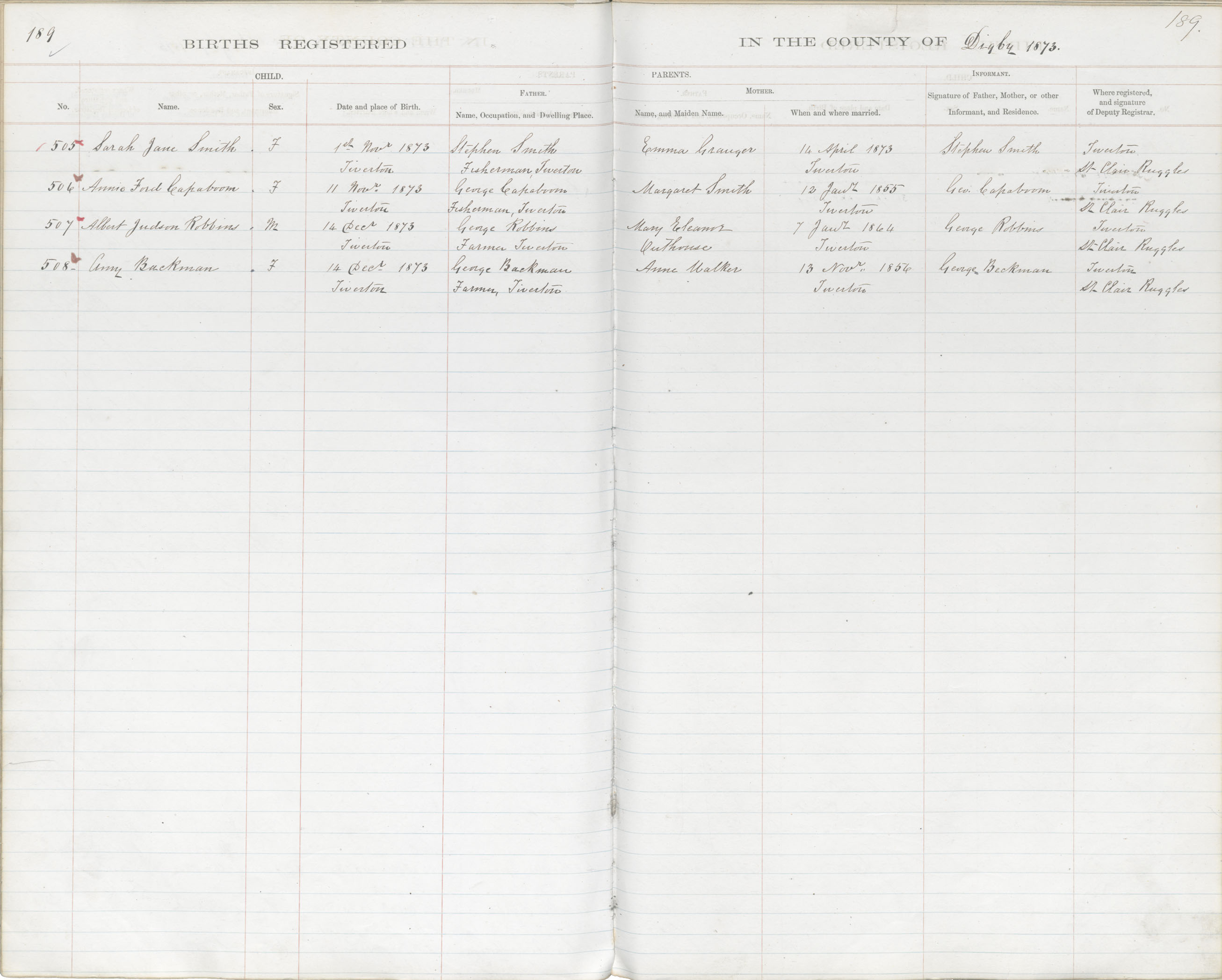 Birth Registration: Year: 1873 book: 1807 page: 189 number: 505