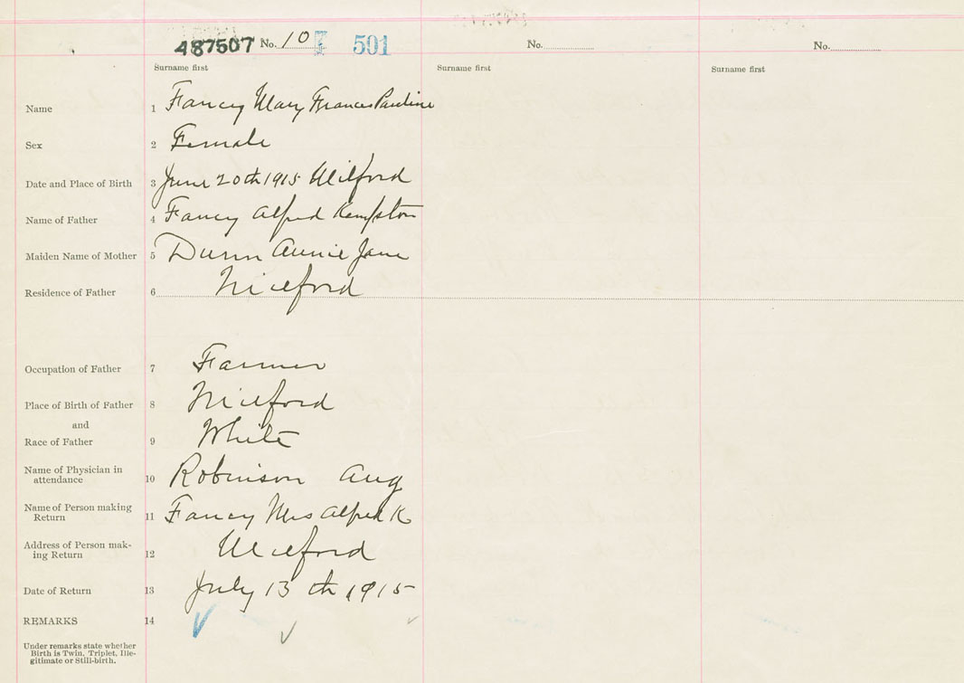 Female Birth Registration: Year: 1915 number: 48700507