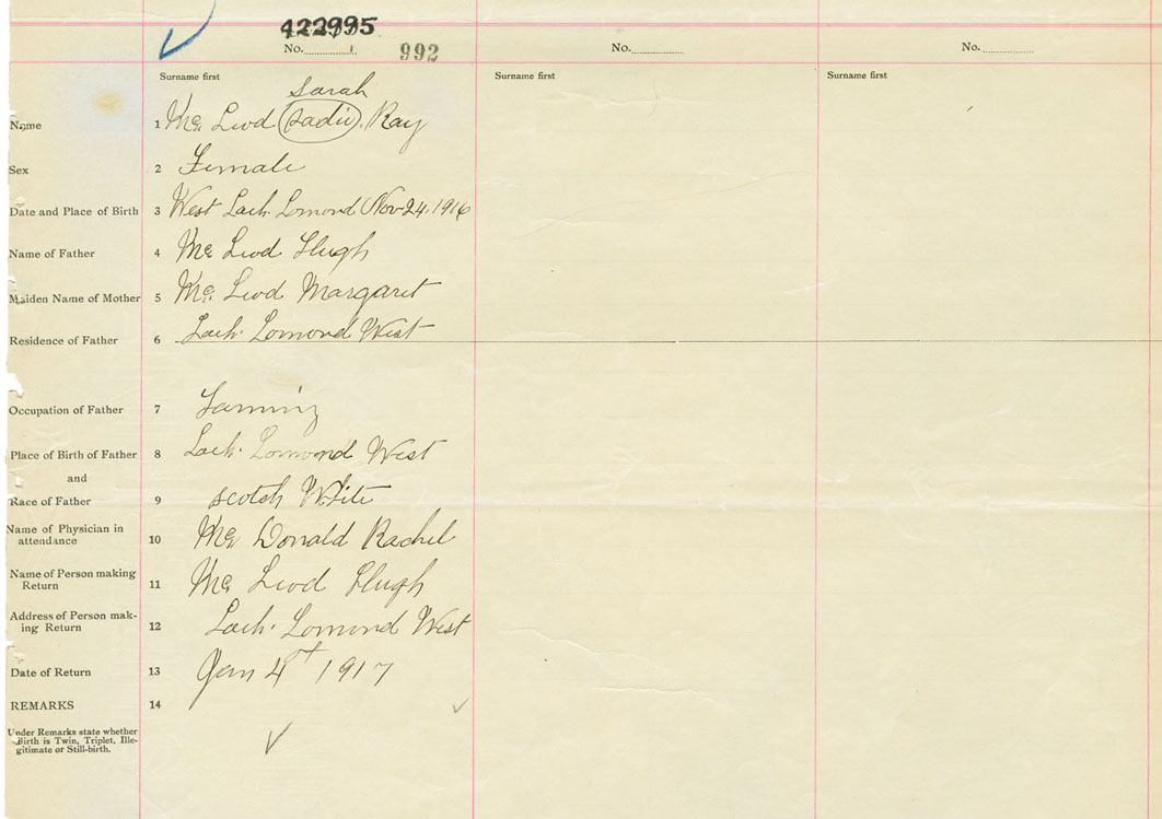 Female Birth Registration: Year: 1916 number: 42200995