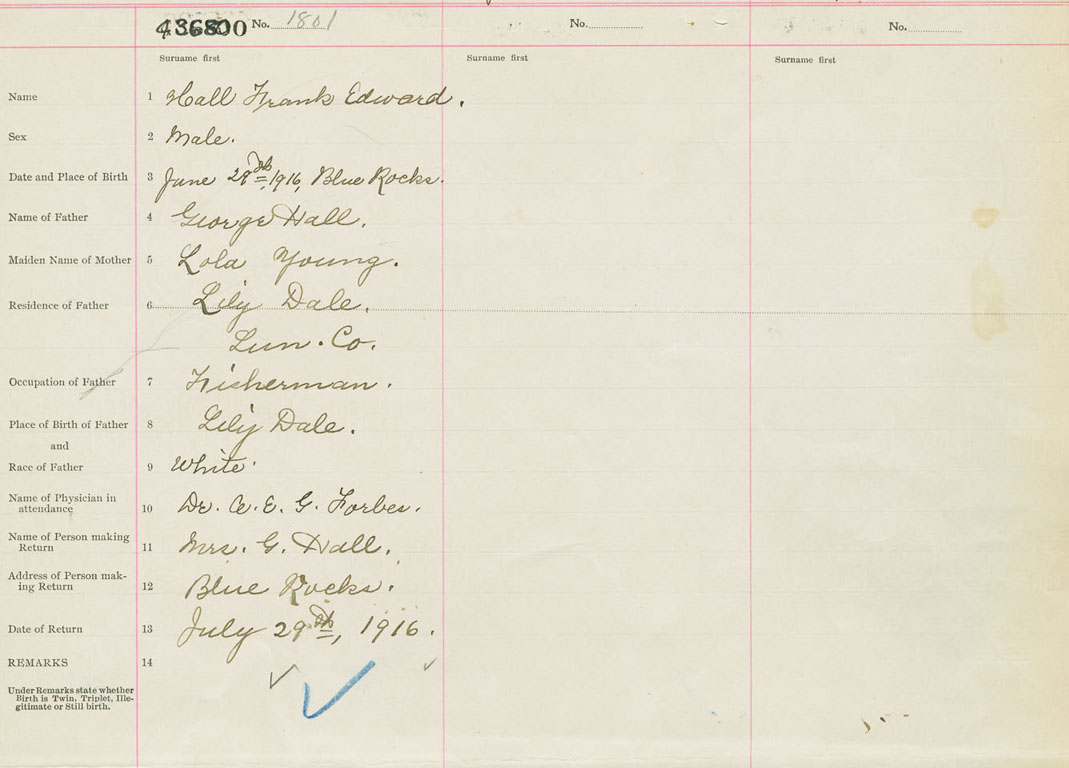 Male Birth Registration: Year: 1916 number: 43600800
