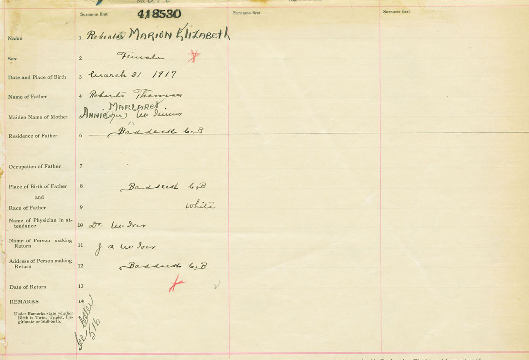 Female Birth Registration: Year: 1917 number: 41800530