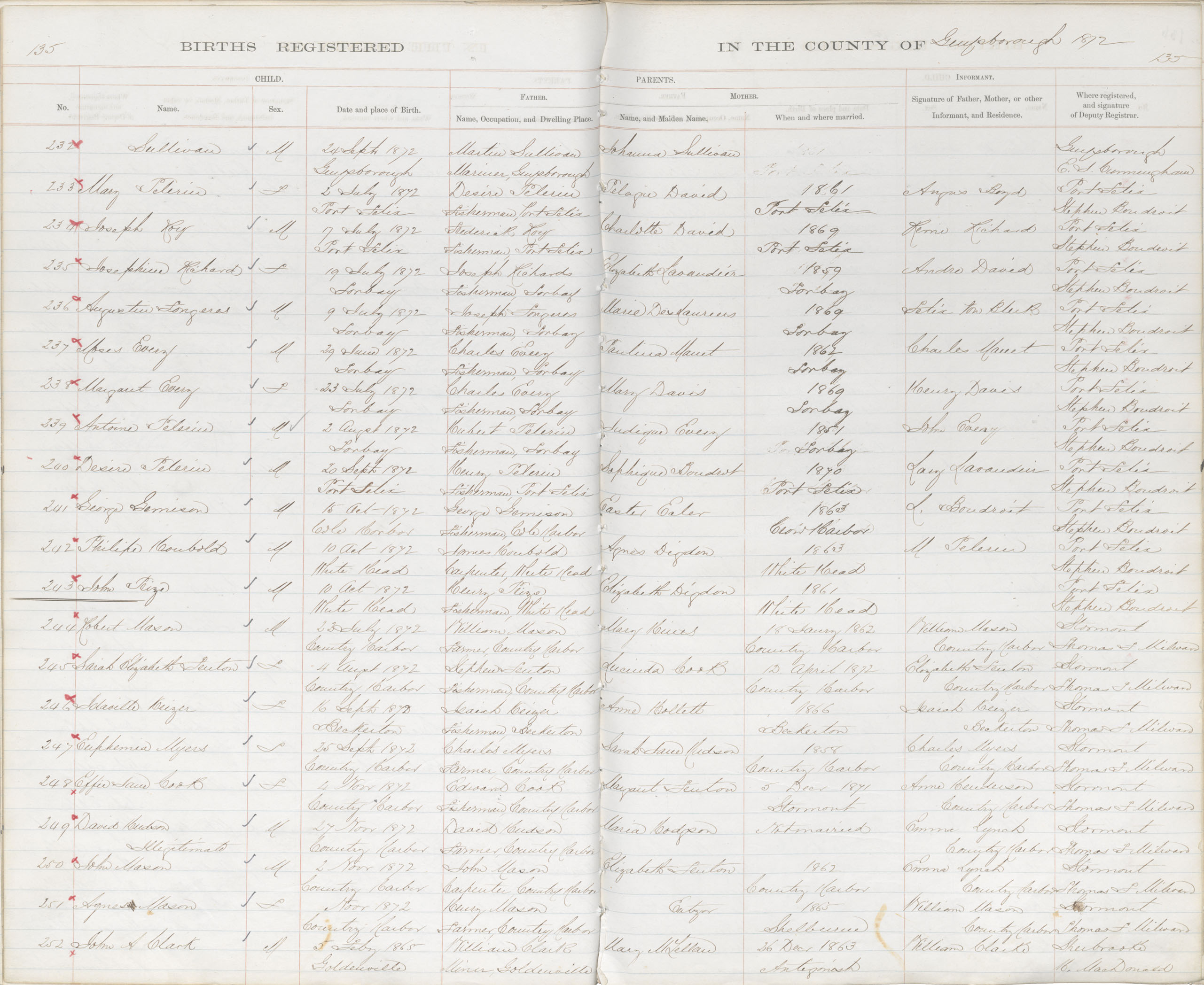 Birth Registration: Year: 1872 book: 1808 page: 135 number: 232