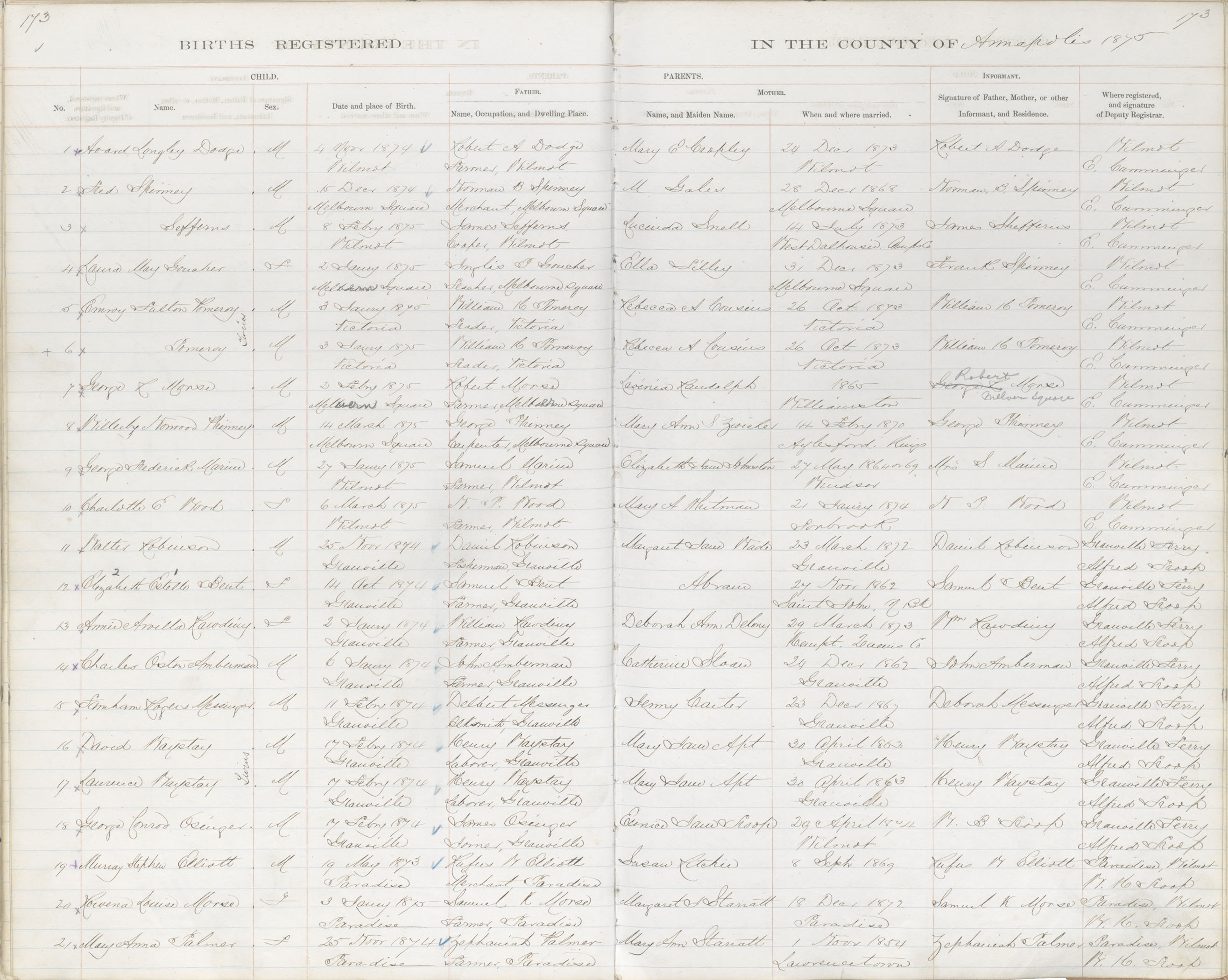 Birth Registration: Year: 1874 book: 1801 page: 173 number: 21