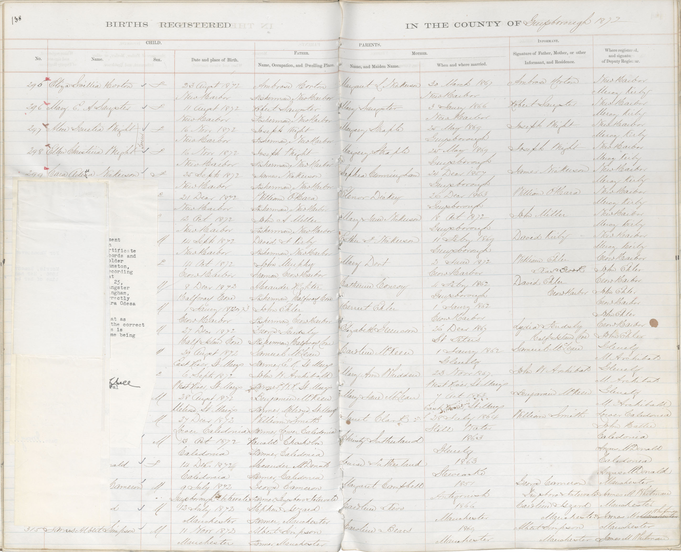Female Birth Registration: Year: 1872 book: 1808 page: 138 number: 298