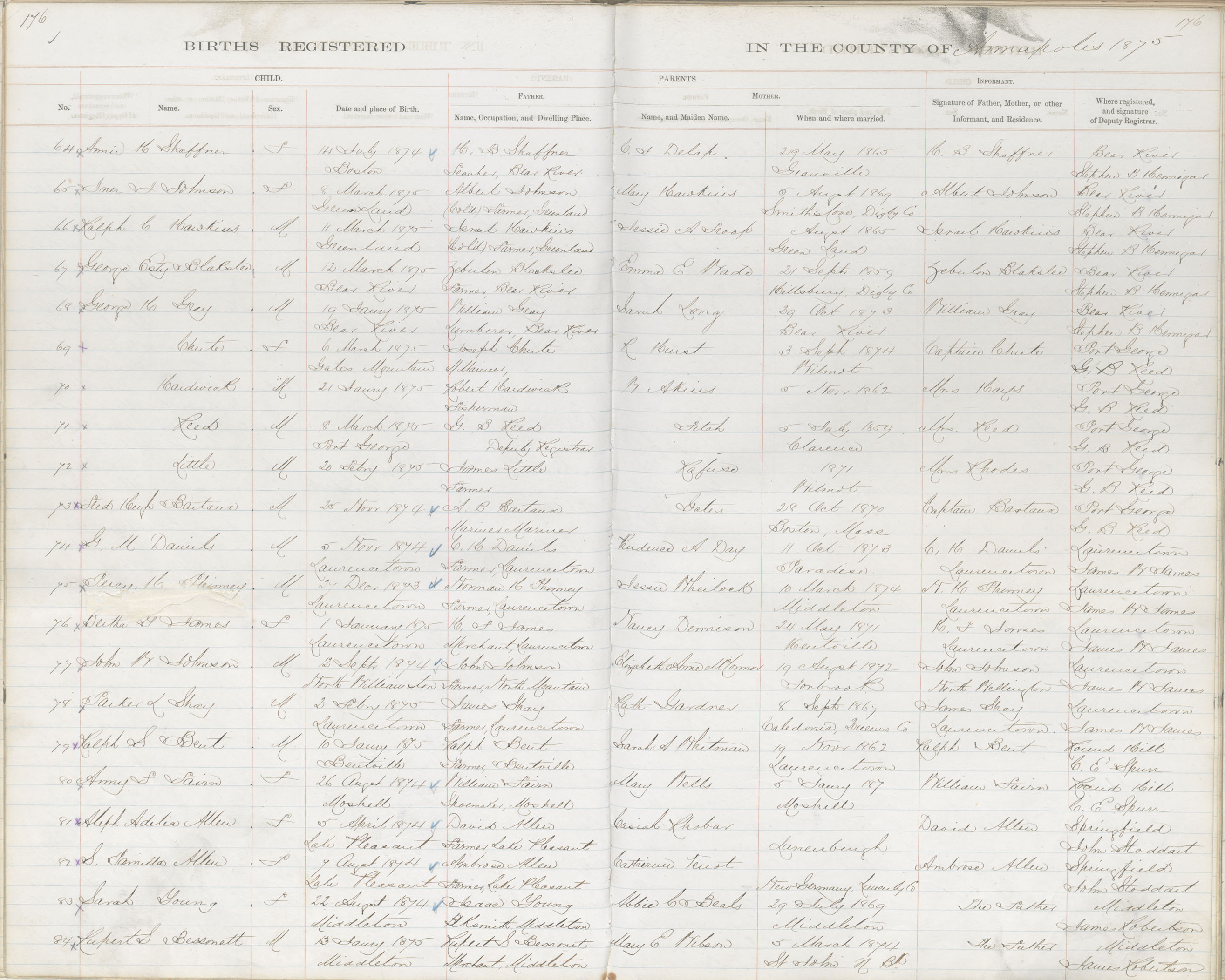 Male Birth Registration: Year: 1875 book: 1801 page: 176 number: 84