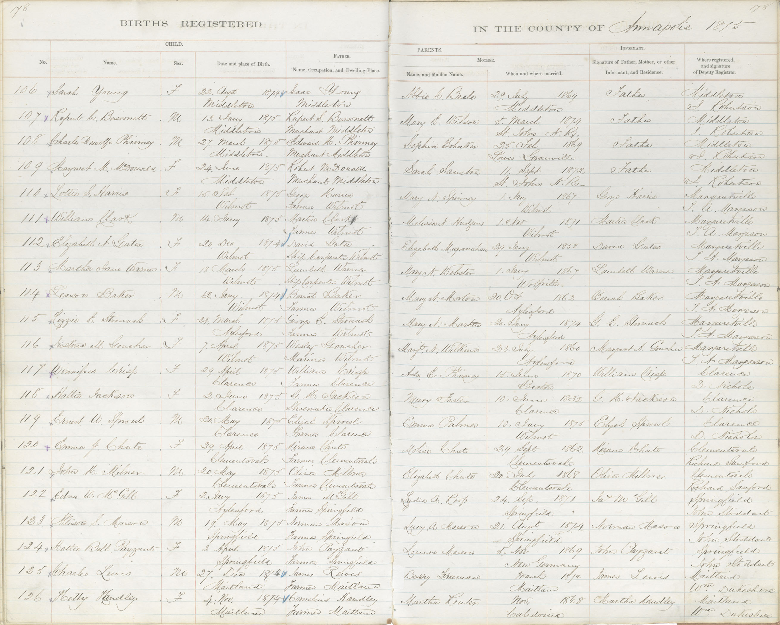 Birth Registration: Year: 1874 book: 1801 page: 178 number: 126