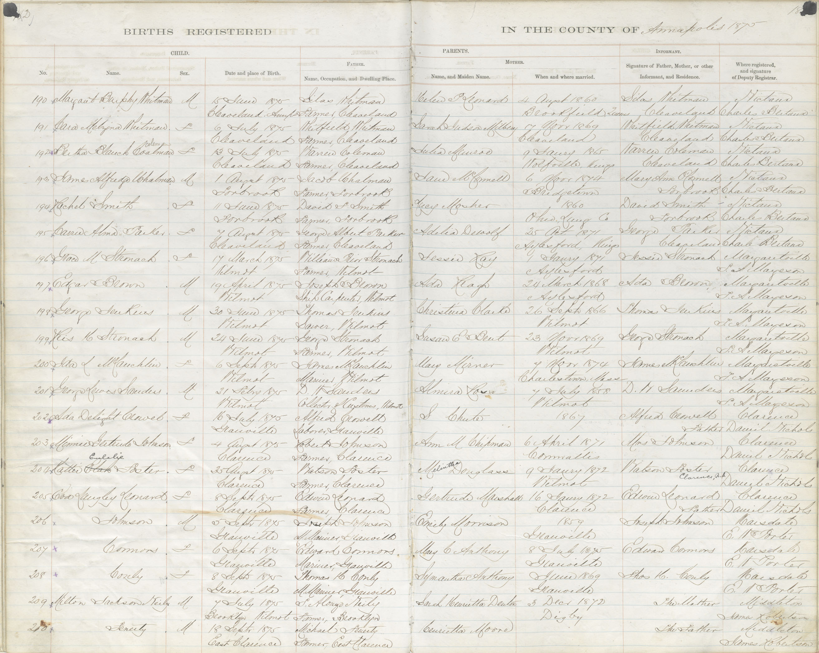 Male Birth Registration: Year: 1875 book: 1801 page: 182 number: 210