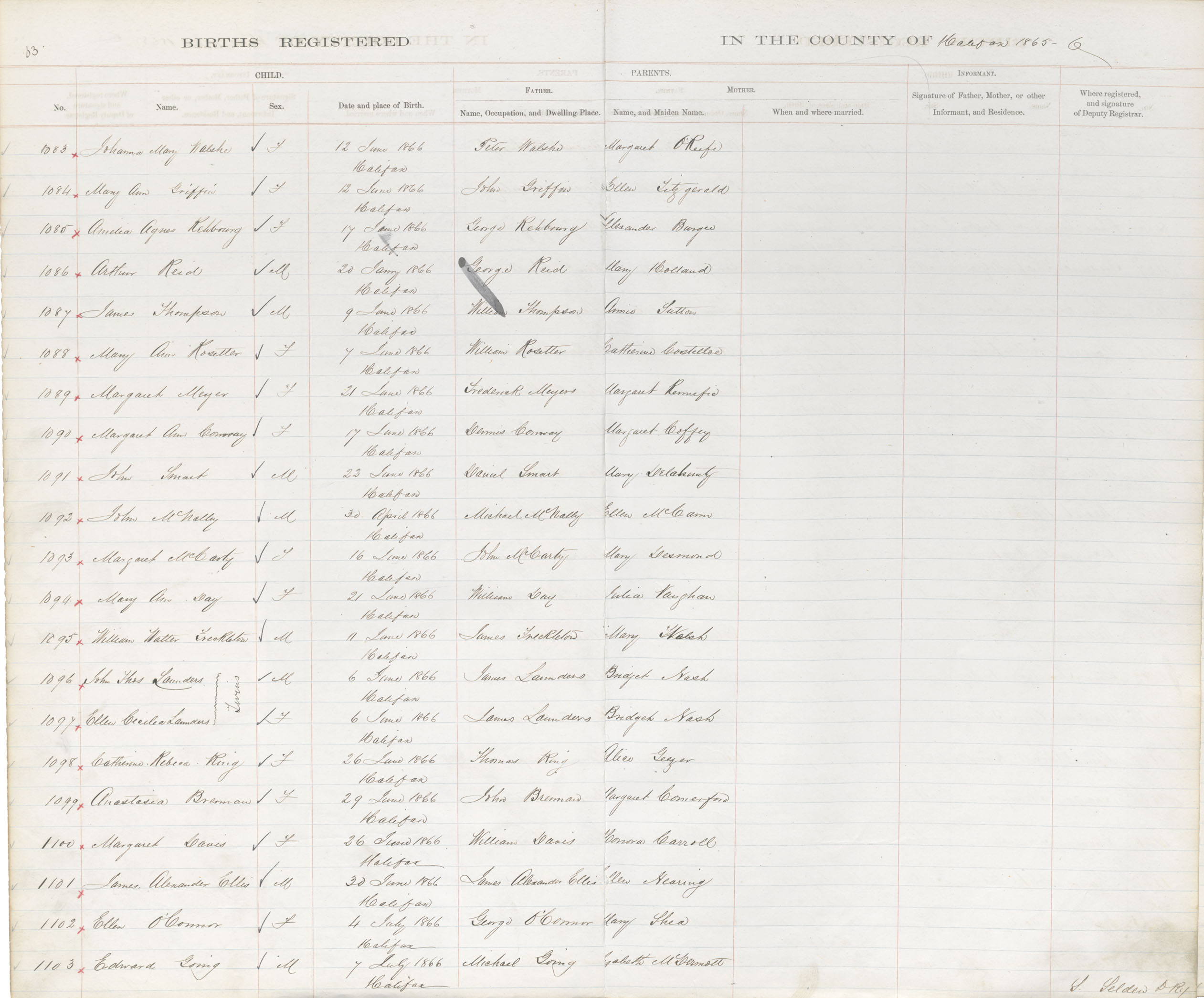 Birth Registration: Year: 1866 book: 1809 page: 63 number: 1083
