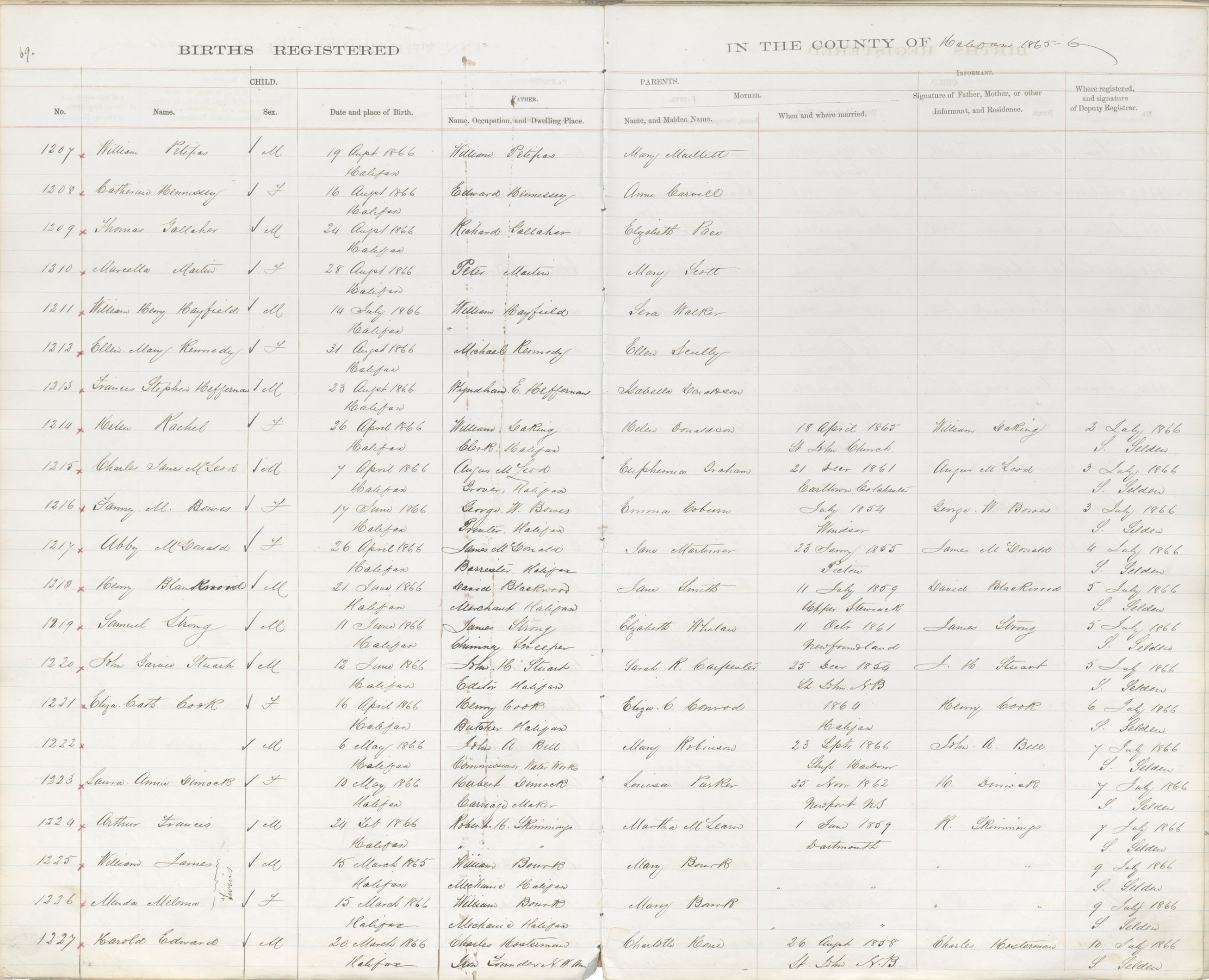 Birth Registration: Year: 1866 book: 1809 page: 69 number: 1227