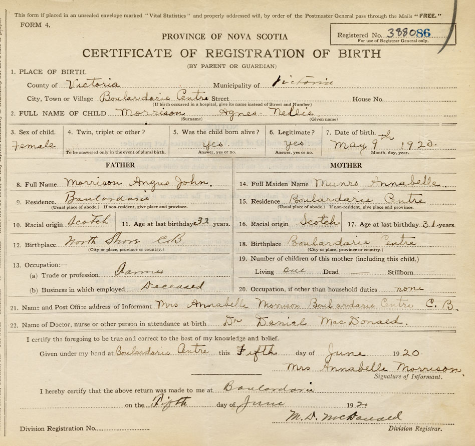 21. Name and Post Office address of Informant Mrs. Annabelle Morrison Boularderie Centre