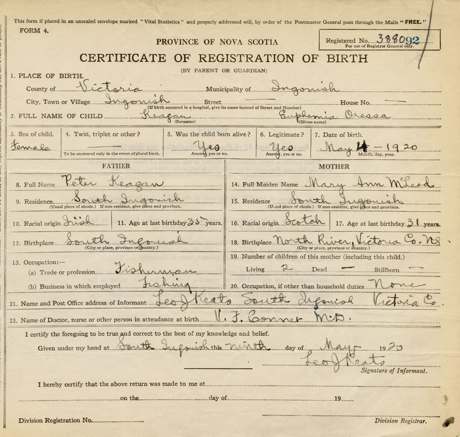 21. Name and Post Office address of Informant Leo J. Keats South Ingonish,Victoria Co.