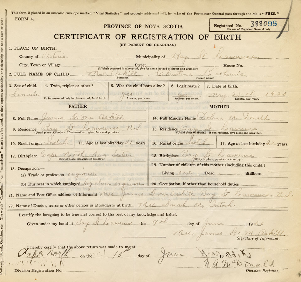 21. Name and Post Office address of Informant Mrs James G. McAskill Bay St Lawrence