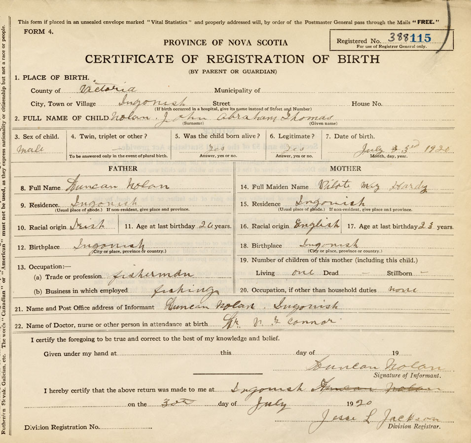 21. Name and Post Office address of Informant Duncan Nolan Ingonish