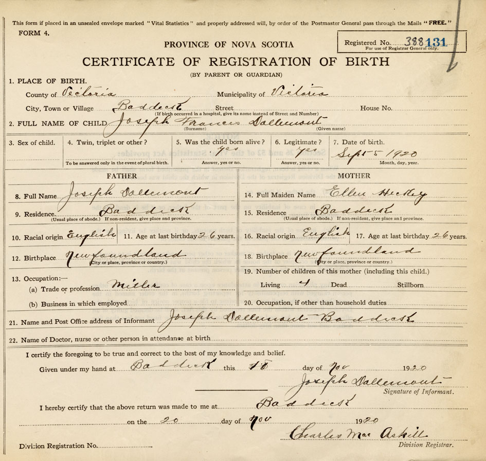 21. Name and Post Office address of Informant Joseph Dallencout Baddeck