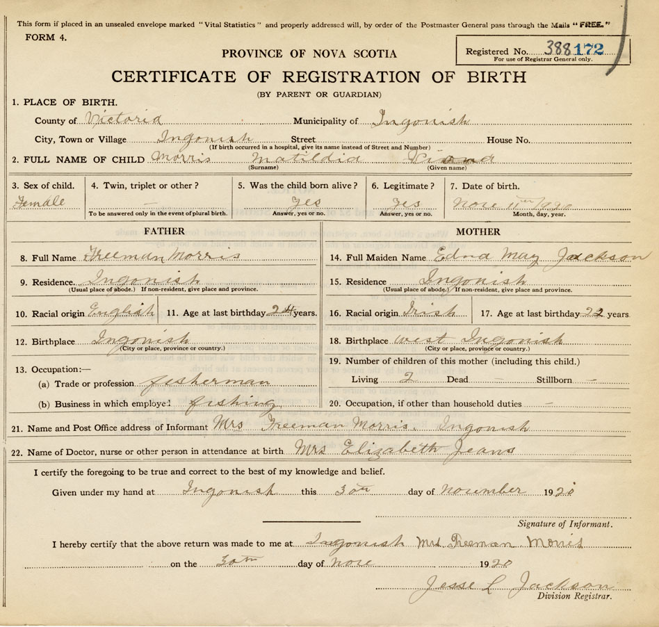 21. Name and Post Office address of Informant Mrs. Freeman Morris Ingonish