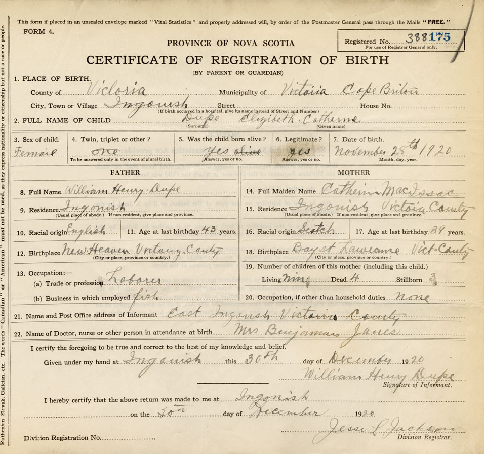 21. Name and Post Office address of Informant William Henry Dupe East Ingonish Victoria County
