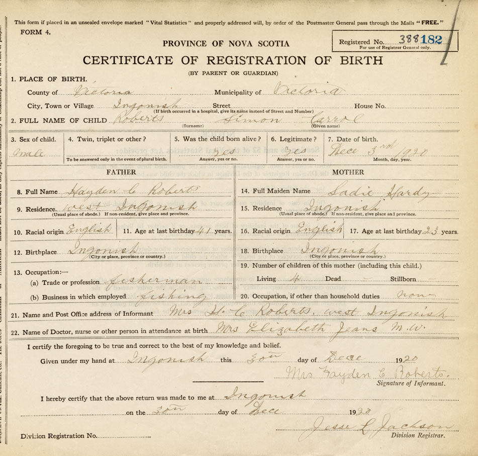 21. Name and Post Office address of Informant Mrs. H. C. Roberts West Ingonish