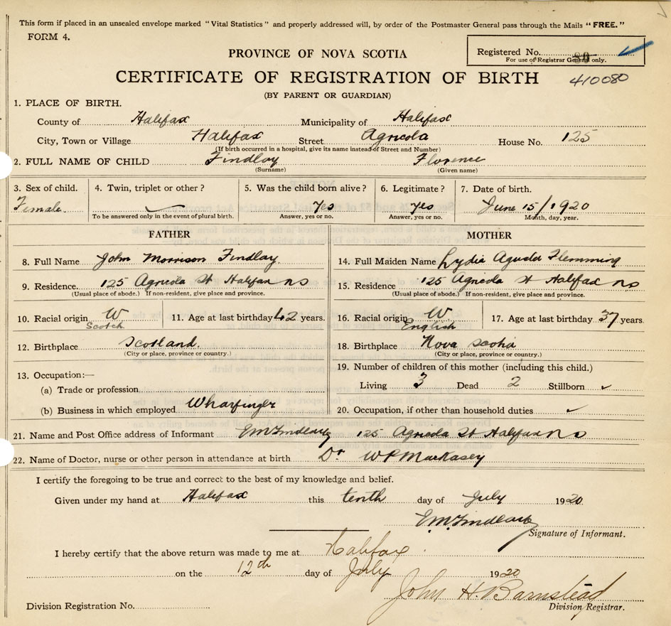 21. Name and Post Office address of Informant J. M. Findlay 125 Agricola St., Halifax