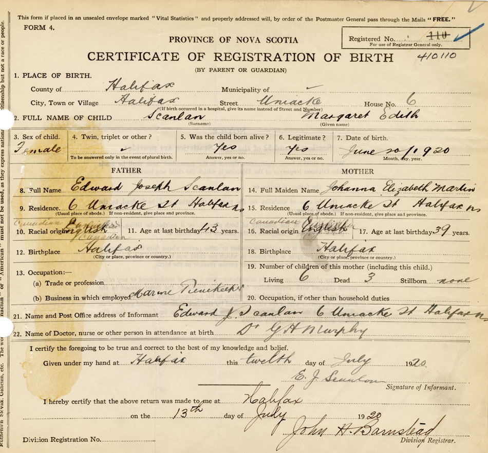 21. Name and Post Office address of Informant Edward J. Scanlon 6 Uniacke St., Halifax