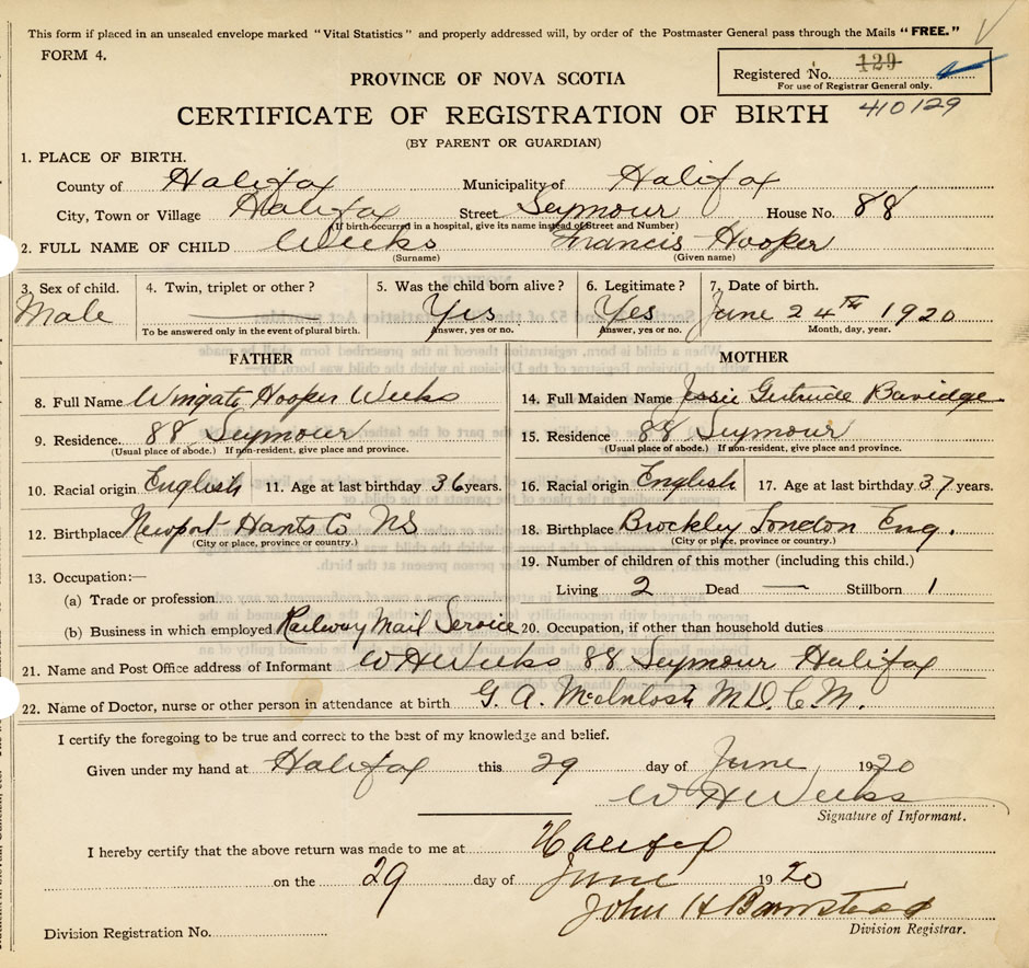 21. Name and Post Office address of Informant W.H. Weeks 88 Seymour, Halifax