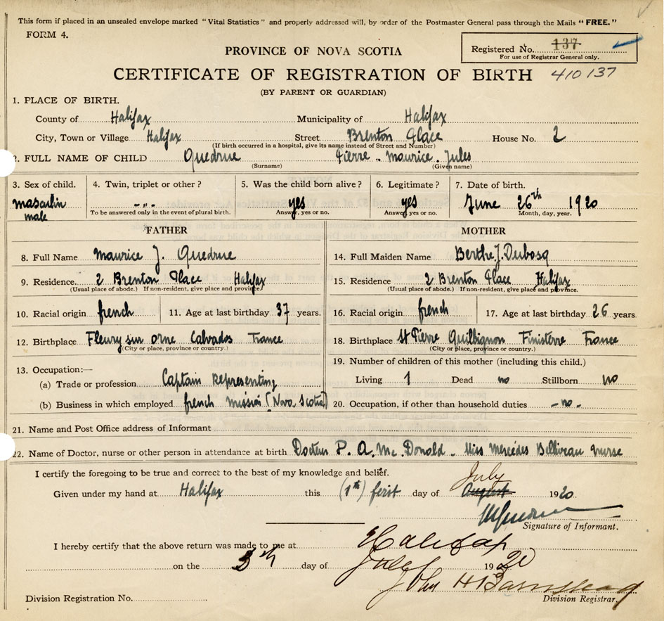 22. Name of Doctor, nurse or other person in attendance at birth Docteur P.A. McDonald; Miss Mercedes Belliveau- Nurse