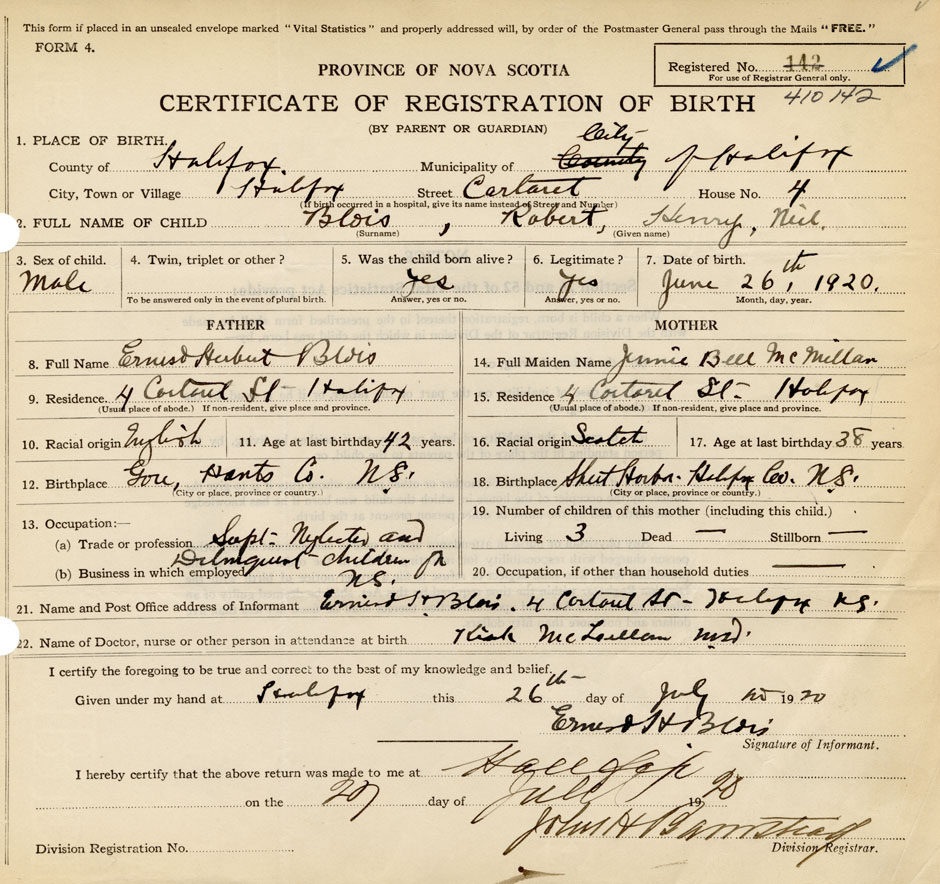 21. Name and Post Office address of Informant Ernest H. Blois 4 Carteret St., Halifax