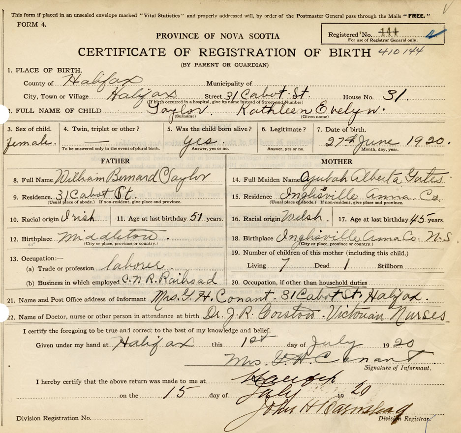 21. Name and Post Office address of Informant Mrs. G. H. Conant 31 Cabot St., Halifax