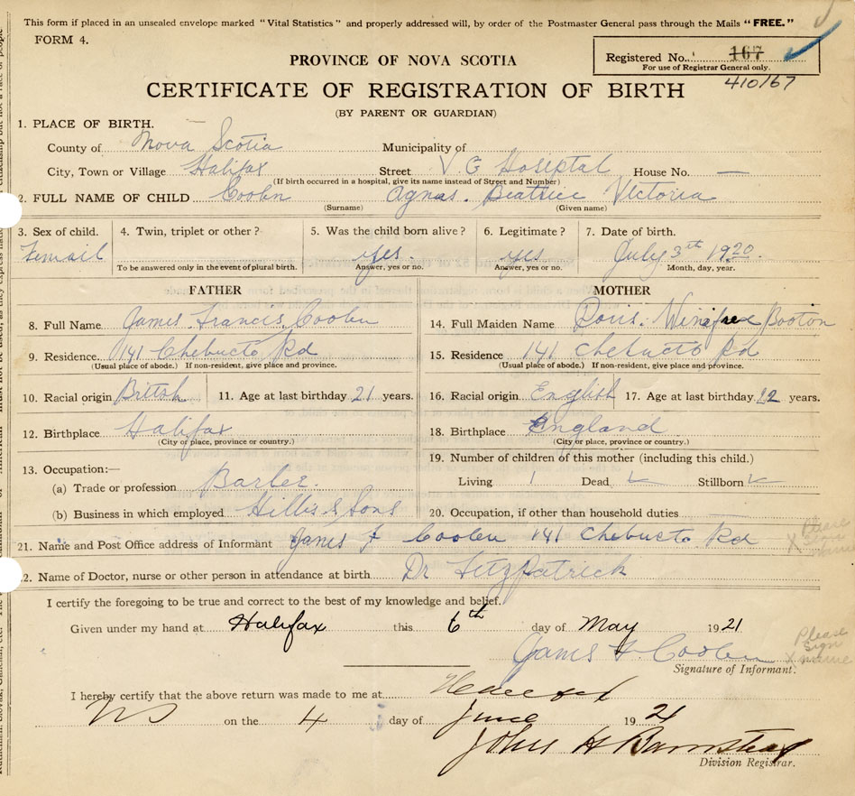 21. Name and Post Office address of Informant James F. Coolen 141 Chebucto Rd.