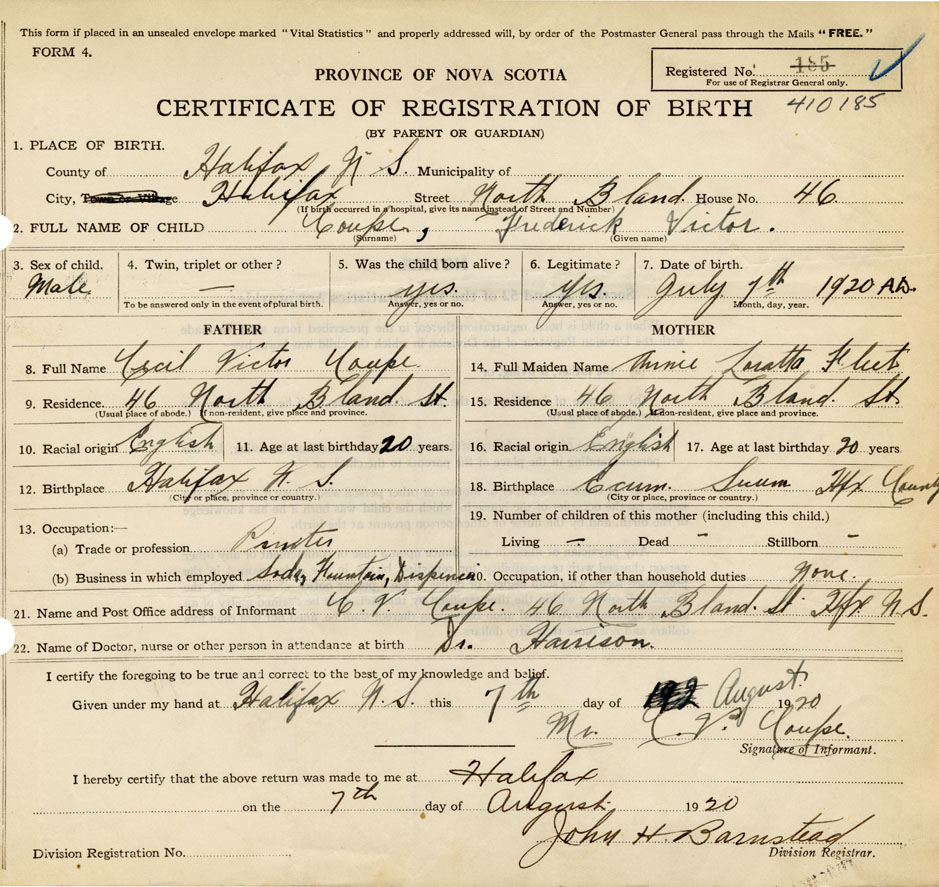 21. Name and Post Office address of Informant C. V. Coupe 46 North Bland St., Halifax