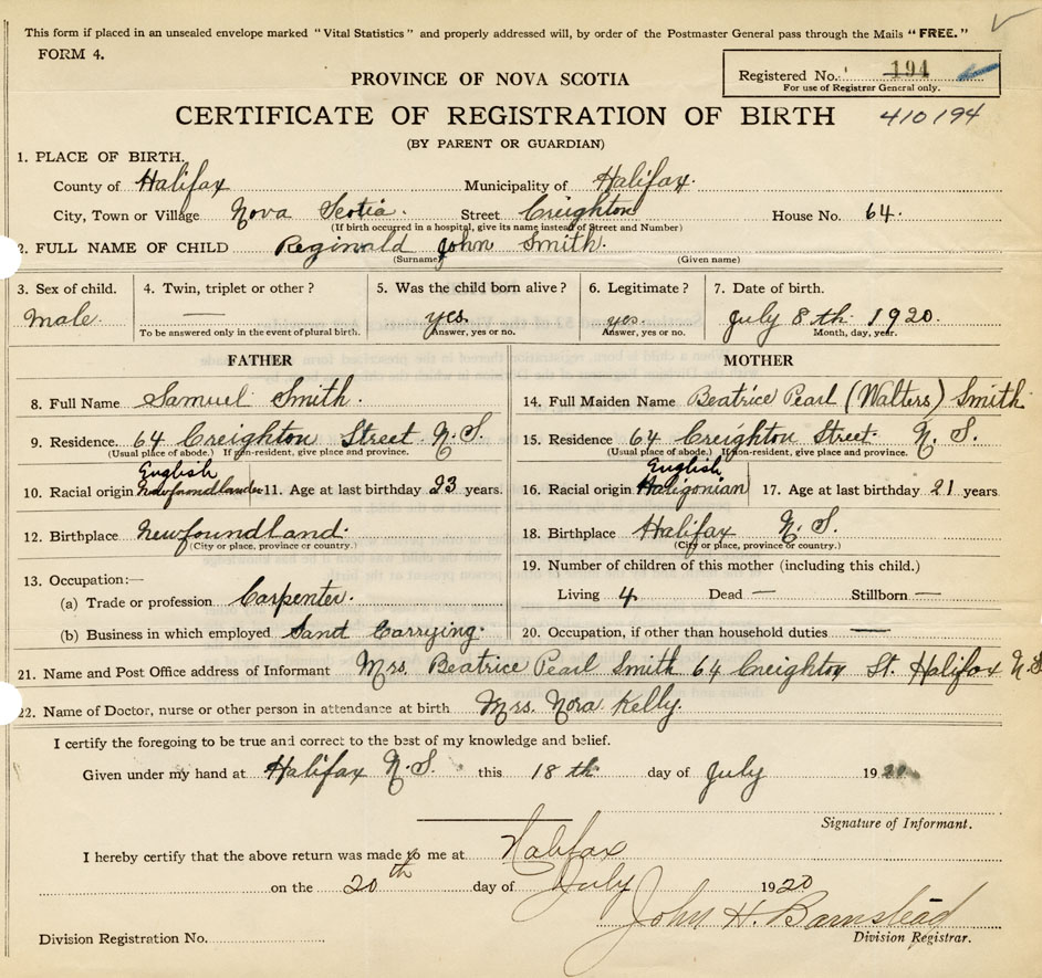 21. Name and Post Office address of Informant Mrs. Beatrice Pearl Smith 64 Creighton St., Halifax