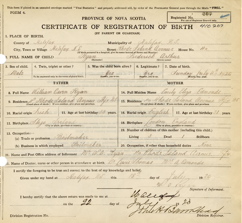 21. Name and Post Office address of Informant Mr. W. O. Ryan 4a Rhode Island Avenue, Halifax