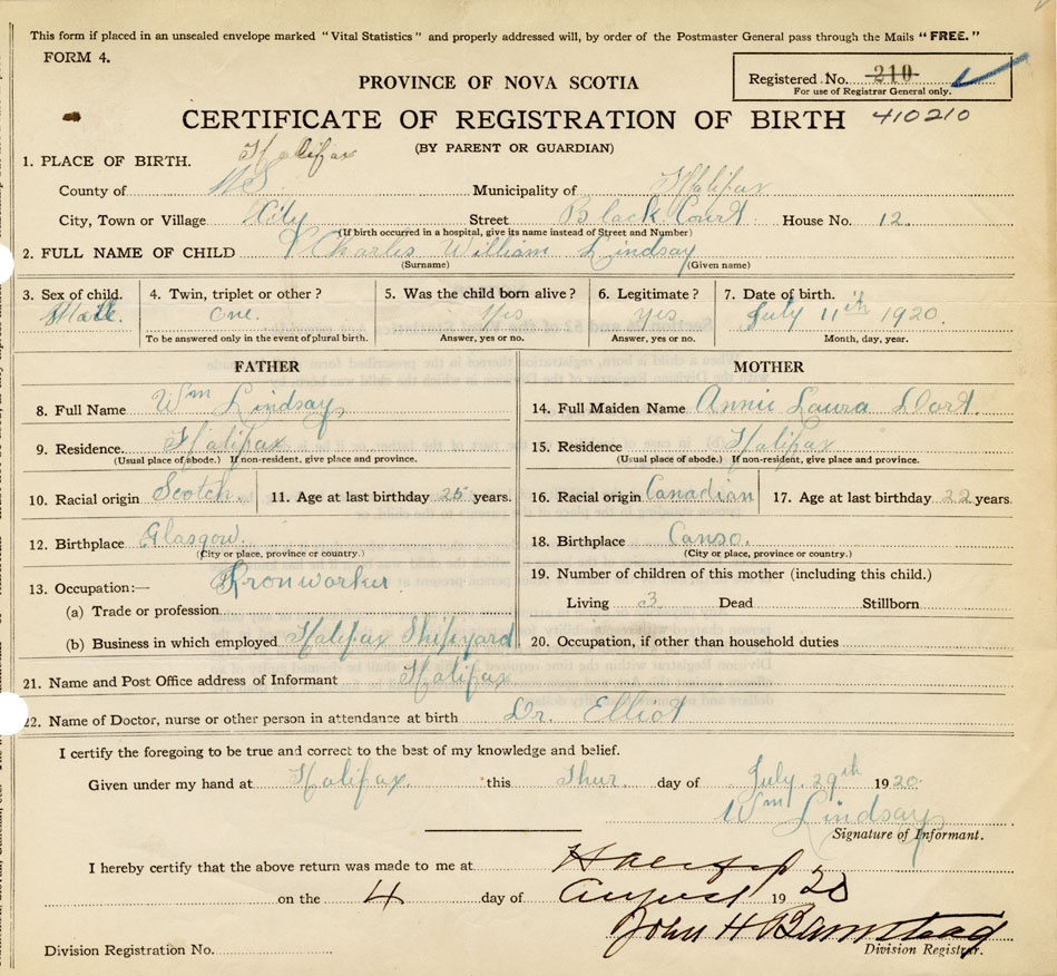 21. Name and Post Office address of Informant Wm. Lindsay Halifax