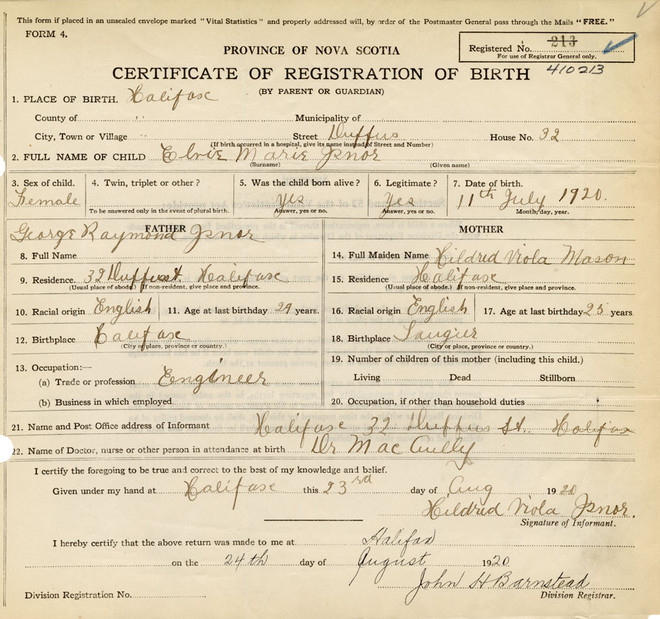 21. Name and Post Office address of Informant Mildred Viola Isnor 32 Duffus St., Halifax