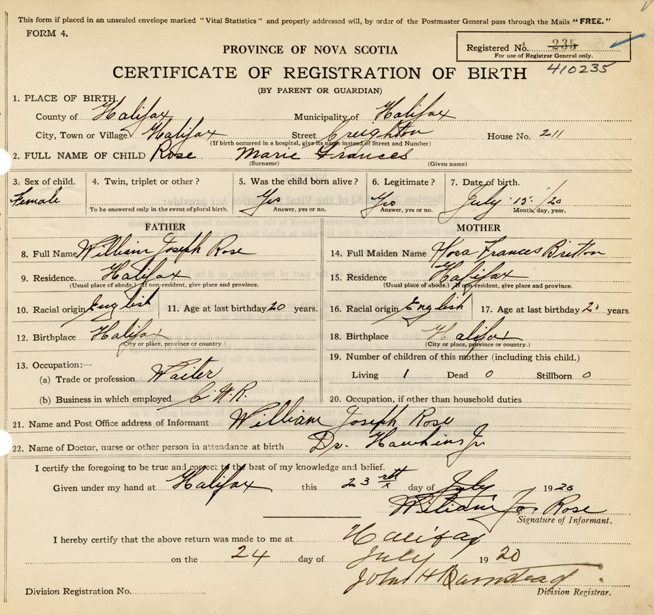 21. Name and Post Office address of Informant William Joseph Rose Halifax