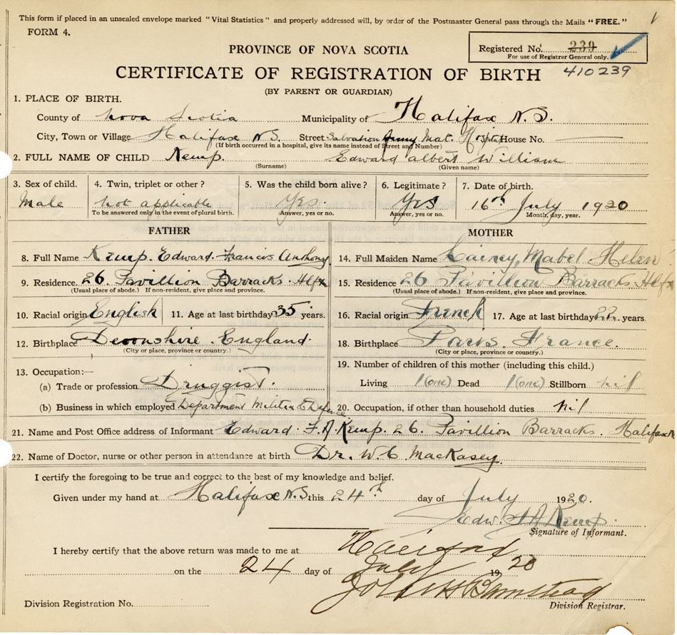 21. Name and Post Office address of Informant Edward F. A. Kemp 26 Pavillion Barracks, Halifax