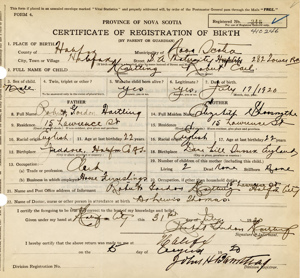 21. Name and Post Office address of Informant Robert Gordon Hartling 15 Lawrence St., Halifax City