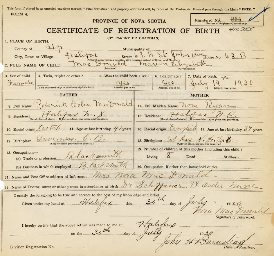 21. Name and Post Office address of Informant Mrs. Nora MacDonald Halifax