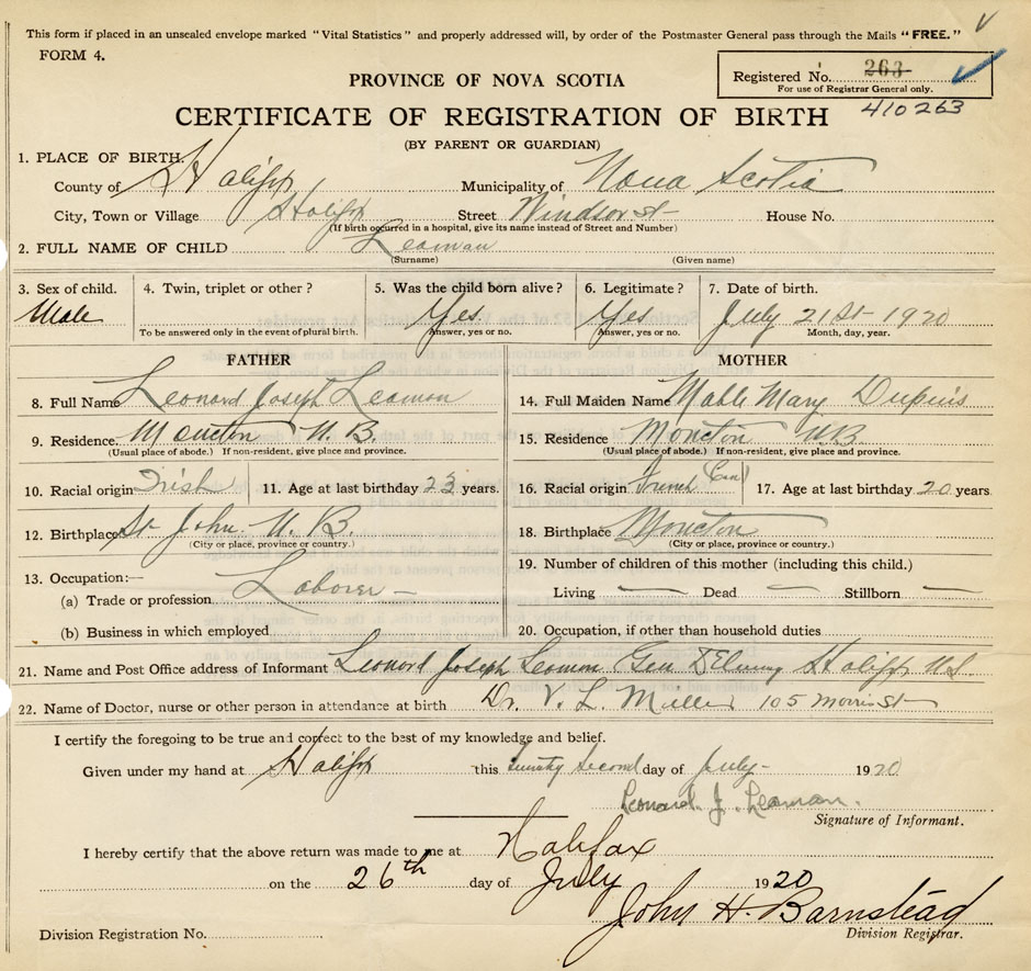 21. Name and Post Office address of Informant Leonard Joseph Leaman Gen. Delivery, Halifax