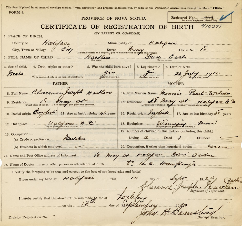 21. Name and Post Office address of Informant Clarence Joseph Hartlen 18 May St., Halifax