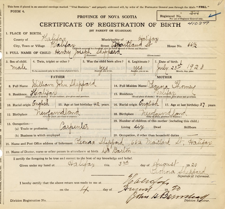 21. Name and Post Office address of Informant Leonora Sheppard 66 1/2 Maitland St., Halifax