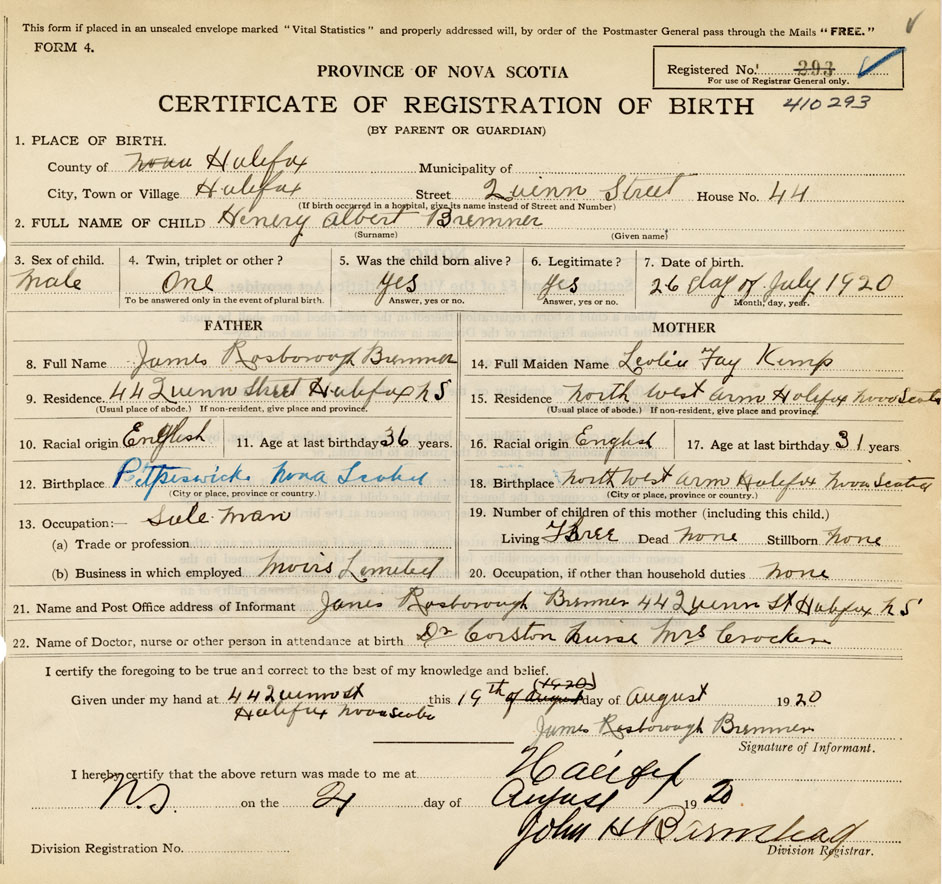 21. Name and Post Office address of Informant James Rosborough Bremner 44 Quinn St., Halifax